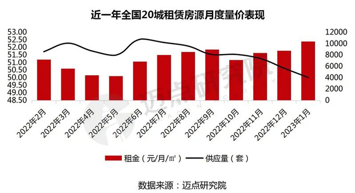 1月整体租赁市场活跃度明显回升,全国20城租赁房源租金52.39元/月/㎡,环比上升1.2%。同比2022年1月,一线、新一线城市均恢复到去年同期水平。预计在春节假期过后,随着疫情因素逐步消解,以及节后“返工季”的到来,需求逐渐回升,租赁市场或将会继续回暖。