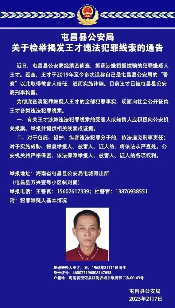 为彻底查清犯罪嫌疑人王才的全部犯罪事实,现面向社会公开征集王才各类违法犯罪线索。