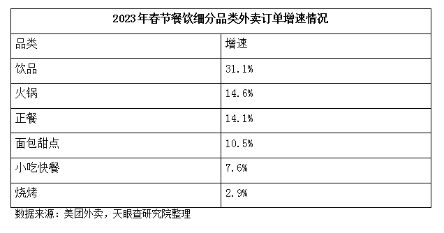 虽然春节餐饮市场整体回暖迹象明显,但是各个餐饮细分品类的回暖速度并不一致,饮品和火锅这两个细分品类引领整个餐饮市场的复苏。美团外卖数据显示,2023年春节期间,饮品和火锅的订单量同比去年增速最高,分别达到了31.1%和14.6%,正餐和面包甜点品类跟随其后。