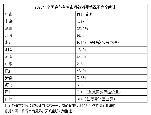 据商务部监测,春节期间全国重点零售和餐饮企业销售额与去年春节相比,增长了6.8%,全国多个省市的餐饮收入有所上涨。具体来看,广州全市住宿餐饮营业额超40亿元,同比增长31%,已超2019年同期水平;深圳餐饮业消费金额共达73541.37万元,同比增长25.93%;北京市商务局重点监测的百货、超市、专业专卖店、餐饮和电商等企业实现销售额50.9亿元,较2019年同期增长13.2%;江苏省餐饮业零售总额达130.3亿元,同比增长9%;湖南省餐饮企业春节假期累计实现销售25.18亿元,较去年同期增长13.8%。