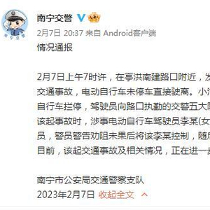 2月7日上午7时许,在亭洪南建路口附近,发生一起电动自行车与小汽车刮碰的交通事故,电动自行车未停车直接驶离。小汽车随后追赶至亭洪南建路口将电动自行车拦停,驾驶员向路口执勤的交警五大队警员报警请求处置。警员上前处置该起事故时,涉事电动自行车驾驶员李某(女)情绪激动,拒不配合并反复拉扯警员,警员警告劝阻未果后将该李某控制,随后移交辖区派出所处理。