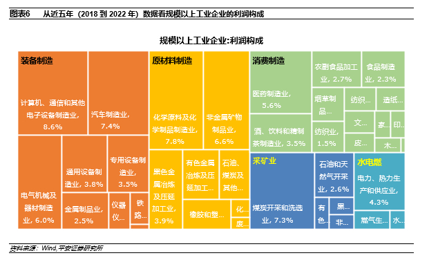 首先,明确工业企业利润的构成,以近五年(2018到2022年)的均值数据看,我国规模以上工业利润规模占比最大的行业依次是计算机、通信和其他电子设备制造业(8.6%)、化学原料及化学制品制造业(7.8%)、汽车制造业(7.4%)、煤炭开采和洗选业(7.3%)、非金属矿物制品业(6.6%)、电气机械及器材制造业(6.0%)、医药制造业(5.6%),而其余34个行业利润合计占比仅50.8%。按大类板块看,制造业是规模以上工业企业利润最重要的组成部分,占比约82.6%,其中装备制造、原材料制造和消费制造三个板块利润的占比分别为33.9%、25.9%、22.8%,三者皆高于采矿业的11.7%,更远超水电燃气板块的5.7%。