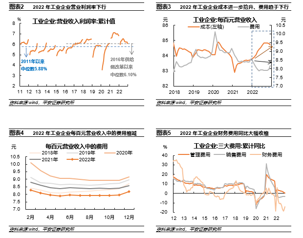2022年工业利润同比收缩。2022年规模以上工业企业利润累计同比增速探底,全年同比收缩4.0个百分点,不仅远低于2022年相对2019年18.5%的复合增速,也是十余年间利润降幅最大的一年。节奏上,工业企业盈利累计同比增速自2022年二季度不断走弱。工业企业产需先后受4-5月多地疫情散发、7月房地产“交楼”事件、四季度出口收缩、12月第一波疫情全面达峰等负面冲击。拆分看,营业利润率回落是工业企业利润收缩的核心原因,量、价亦形成一定拖累。尽管工业企业费用占比趋降,但未能充分抵消成本占比抬升的影响,因而营业利润率较快压缩。