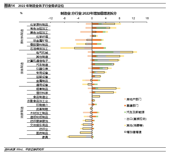 最后是国内消费的影响。一方面,国内消费疲弱,对医药及可选消费制造相关行业的拖累较强,这与相关行业出口增速的走弱形成共振。我们的测算表明,国内消费及其他需求对医药、纺织、文体娱乐用品、纺织服装服饰、造纸和纸制品行业增加值的拖累分别为3.1、2.6、2.0、1.7、1.0个百分点,对应的行业利润增速分别为-6.1%、-19.9%、-1.1%、-32.2%和-32.1%。另一方面,尽管2022年国内消费整体偏弱,但必选消费在居民囤货需求的支撑下表现尚可。国内消费对烟草制品、酒饮料茶、食品制造、农副产品加工等必选消费相关行业增加值的拉动分别为6.4、5.9、2.1、0.5个百分点,对应的行业利润增速分别为12.4%、17.5%、8.5%和0.7%。