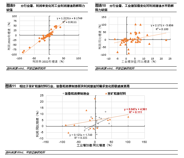 其次,各行业的“量”,即工业增加值的变化均较稳定,其变化对利润增速的解释力偏弱。同样以2022年不同行业截面数据的单变量回归结果看,工业增加值增速对利润增速的解释力仅9.98%(R平方值)。不过,相比于采矿和原材料行业,装备和消费制造板块利润增速对需求变化的敏感度更高(回归系数更大、R平方值更高)。