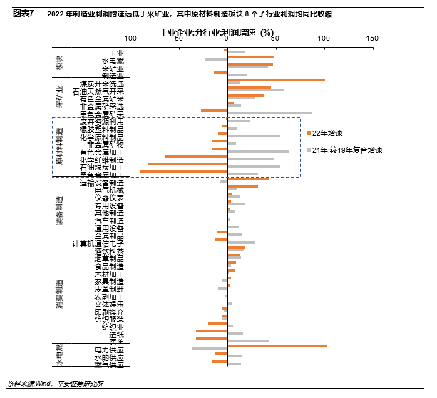 对应于2022年各板块和行业的利润增速,我们发现: