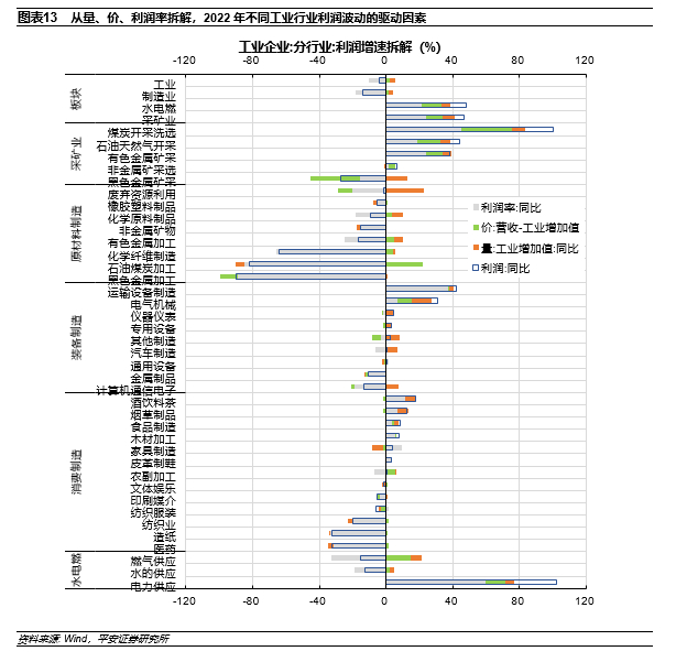 工业利润数据的结构线索。1)2022年,作为工业主体的制造业表现偏弱,利润同比收缩13.8%;但采矿业和水电燃气行业的利润增速分别高达48.3 %和47.2%。从板块间利润分配格局看,利润自原材料板块向采矿和装备制造板块转移:前期偏强的上游采矿板块利润占比进一步提升,原材料板块利润占比较快回落,装备制造板块的利润占比自低位明显提升,而前期偏弱的消费制造板块利润占比仍处低位。2)从量、价、利润率三个维度拆解,采矿板块利润增速较快,受量增、价涨、利润率上行三大因素的共同推动。原材料制造板块部分行业的价格稳中有升,但利润率压缩拖累其利润同比收缩。消费制造和装备制造板块内部存在较大分化。其中利润增速较高的运输设备制造、电气机械、酒饮料茶、烟草制品行业“量”与“利润率”同步走强;利润同比收缩的计算机通信电子、金属制品、医药、造纸、纺织等行业则受到“量减”与“利润率压缩”的双重挤压。3)从不同终端需求的影响看,出口虽对装备制造板块的需求形成较强支撑,但对医药及可选消费板块的需求形成一定拖累;建筑链条对原材料制造板块的多个子行业生产和利润产生拖累,但对装备制造板块部分行业的生产和利润有一定支撑;国内消费疲弱,对医药及可选消费制造相关行业的拖累较强,但必选消费在居民囤货需求的支撑下表现尚可。