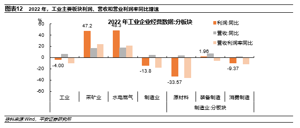 2022年全年看,原油、天然气、煤炭等能源价格中枢处近年来的高位,而国内需求在疫情冲击下相对疲弱,因而上游采矿行业利润维持较高增速,中下游制造板块承受需求收缩、供给冲击双重压力,盈利空间遭遇挤压。