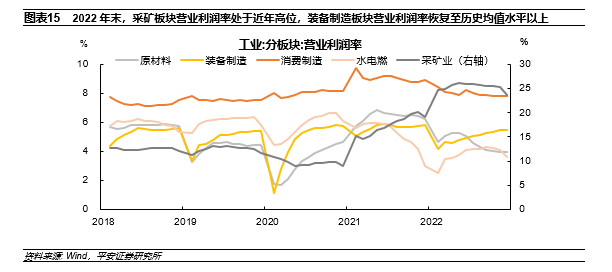 但边际上看,2022年四季度板块间的利润分配格局已有“物极必反,均值回归”的苗头。2022年四季度,装备制造板块的利润占比虽延续升势,但采矿板块利润占比有见顶回落的迹象,原材料和消费制造板块利润占比在低位有所企稳。