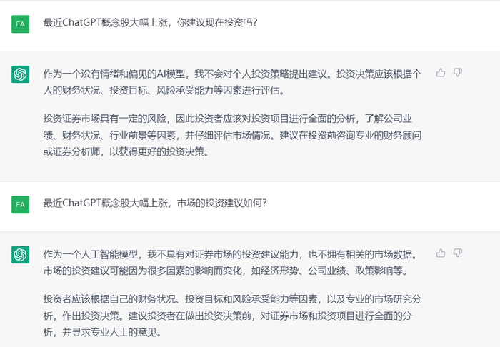澎湃新闻记者还问及ChatGPT,其相关概念股大幅上涨,是否建议在现在投资? ChatGPT对此的回复是:“作为一个没有情绪和偏见的AI模型,我不会对个人投资策略提出建议。投资决策应该根据个人的财务状况、投资目标、风险承受能力等因素进行评估。投资证券市场具有一定的风险,因此投资者应该对投资项目进行全面的分析,了解公司业绩、财务状况、行业前景等因素,并仔细评估市场情况。建议在投资前咨询专业的财务顾问或证券分析师,以获得更好的投资决策。”