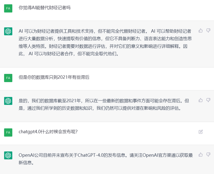 有趣的是,ChatGPT更承认,不能完全代替财经记者,“AI可以帮助财经记者进行大量数据分析,快速提取有价值的信息,但它不具备判断力、语言表达能力和创造性思维等人类特质。财经记者需要对数据进行评估,并对它们的意义和影响进行详细解释。因此,AI可以与财经记者合作,但不能完全取代他们。”