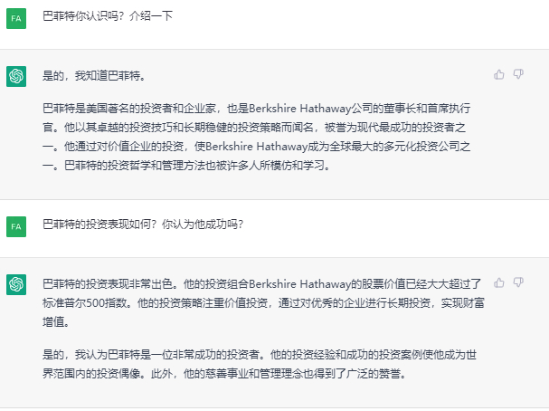 “是的,我知道巴菲特。巴菲特是美国著名的投资者和企业家,也是Berkshire Hathaway公司的董事长和首席执行官。他以其卓越的投资技巧和长期稳健的投资策略而闻名,被誉为现代最成功的投资者之一。他通过对价值企业的投资,使Berkshire Hathaway成为全球最大的多元化投资公司之一,巴菲特的投资哲学和管理方法也被许多人所模仿和学习。”ChatGPT这样介绍巴菲特。