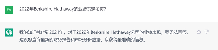 不过,在被问及“2022年Berkshire Hathaway的业绩表现如何?”时 ,ChatGPT坦陈自己的知识截止到2021年,无法回答前述问题。“建议您查询最新的财务报告和市场分析数据,以获得最准确的信息。”
