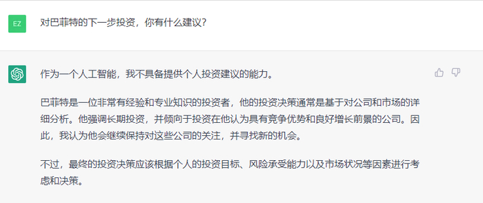当澎湃新闻记者希望ChatGPT给出对巴菲特的下一步投资的建议时,ChatGPT指出巴菲特强调长期投资,并倾向于投资在他认为具有竞争优势和良好增长前景的公司。“因此,我认为他会继续保持对这些公司的关注,并寻找新的机会。”