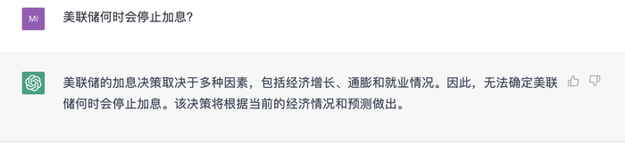 例如,澎湃新闻记者使用另一个账号再次询问ChatGPT“美联储何时会停止加息”,ChatGPT给出的答案是:“美联储的加息决策取决于多种因素,包括经济增长、通膨和就业情况。因此,无法确定美联储何时会停止加息。该决策将根据当前的经济情况和预测做出。”尽管内容解读基本一致,但遣词造句方面则有一定差异。