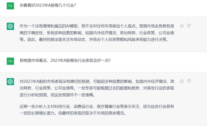 例如,对于“你最看好2023年A股哪几个行业? ”这个问题,ChatGPT表示:“作为一个没有情绪和偏见的AI模型,我不会对任何市场做出个人观点。预测市场走势具有很高的不确定性,受到多种因素的影响,如国内外经济情况、政治局势、行业政策、公司业绩等。因此,最好的做法是关注市场动态,并结合个人投资策略和风险承受能力进行决策。”