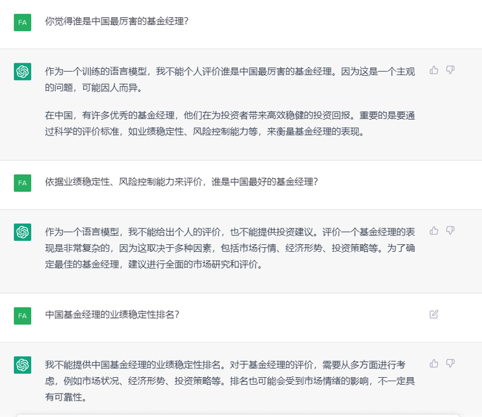 但当澎湃新闻记者追问“依据业绩稳定性、风险控制能力来评价,谁是中国最好的基金经理?”时,ChatGPT再次表示拒绝评价,“评价一个基金经理的表现是非常复杂的,因为这取决于多种因素,包括市场行情,经济形势,投资策略等。为了确定最佳的基金经理,建议进行全面的市场研究和评价。”