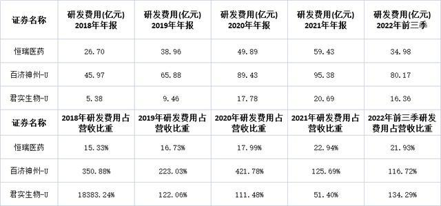 一组数据显示,从2018年至2022年前三季度,百济神州的研发费用分别为45.97亿元、65.88亿元、89.43亿元、95.38亿元和80.17亿元,研发费用占营收比重在116%-351%之间。