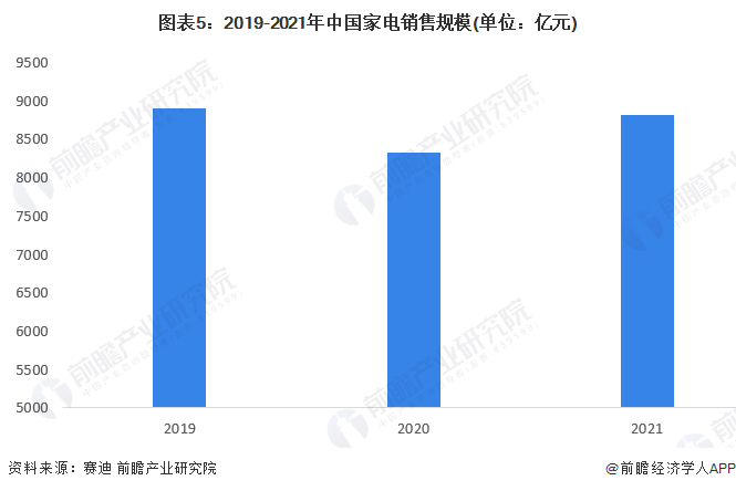 2020年,中国家电销售规模达8333亿元,同比下降6.48%。2021年,中国家电市场规模8811亿元,同比增长5.7%,增长主要来自于下沉市场(三线以下城市、县镇与农村地区)的家电需求。