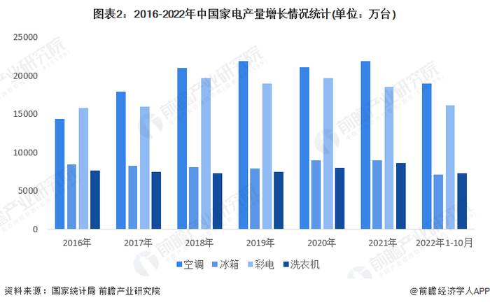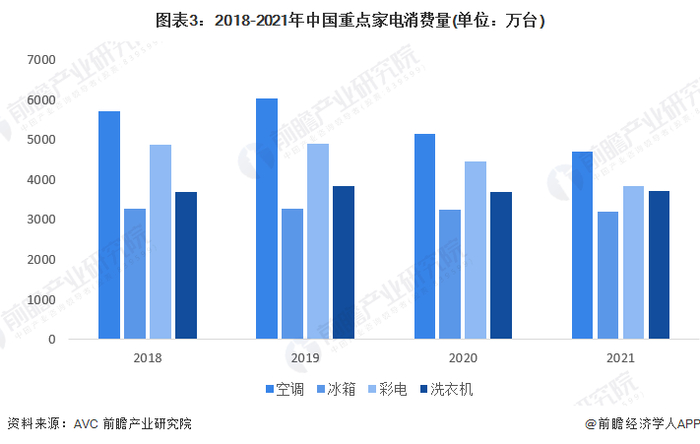根据奥维云网(AVC)数据,2018-2021年中国彩电、空调零售量呈先增加后下降趋势,2021年分别为4689万台,3835万台。2018-2021年中国洗衣机销量基本稳定在3700万台左右,冰箱稳定在3200万台左右,2021年分别为3718万台和3188万台。