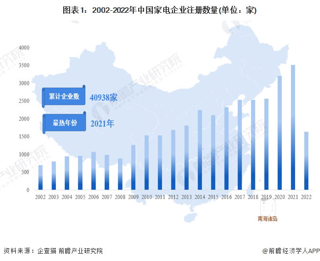 根据中国企业数据库企查猫,目前中国家电行业的主要企业共有40938家,其中以2021年为主要注册热潮,2021年注册企业数量为3504家。