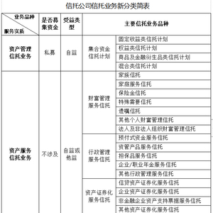 (2)企业资产证券化服务信托。信托公司作为受托人,为按照《证券公司及基金管理公司子公司资产证券化业务管理规定》开展的企业资产证券化业务提供基础资产受托服务。