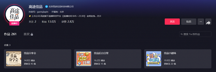 相比于个人IP,高途佳品的表现就不尽如人意。值得注意的是,高途佳品之前,早在去年9月20日高途就曾试水过直播带货,名为“高途好物”。到去年11月16日,高途宣布成立“高途佳品”,陈向东亲自挂帅,高途开始发力直播带货。在直播带货近三个月后,高途好物直播间拥有粉丝13万,账号发布261个视频,仅获赞2.8万。