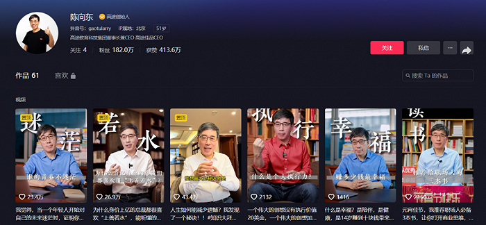今年1月6日,高途创始人、董事长兼CEO陈向东正式入驻抖音,欲在日活超6亿用户的大平台上打造个人IP。
