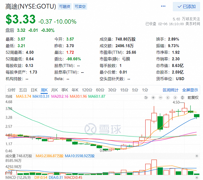 但一个月过去后,高途直播电商业务的进展并不明显,资本市场的表现进入了挣扎阶段。2月6日美股交易日,高途股价下滑10%、盘中一度下跌13%。