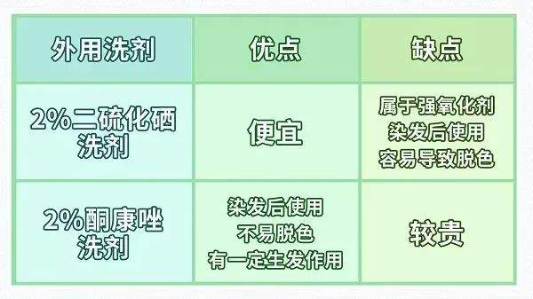 很多人脱发其实属于雄激素性秃发,对此,目前国内市场上主要有两种外用药物洗剂可以帮助我们进行治疗,它们分别为 2% 二硫化硒洗剂和 2% 酮康唑洗剂。这两类药品都具有控油去屑,抑制头皮上马拉色菌的增殖,改善头皮微环境的作用。二者也各有优劣: