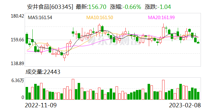 2023年2月8日,安井食品发生了8笔大宗交易,总成交43.75万股,成交金额6487.25万元,成交均价148.28元(其中,机构账户买入7万股,成交额1037.96万元)。当日收盘报价156.70元,跌幅0.66%,成交金额3.54亿元;大宗交易成交金额占当日成交金额18.34%,折价5.37%。
