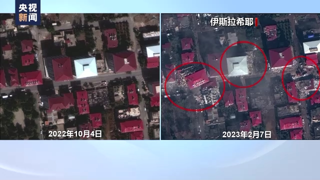 在伊斯拉希耶的另一组卫星图中,可以看到,这几处房屋完全倒塌,房顶甚至因地震发生了位移。