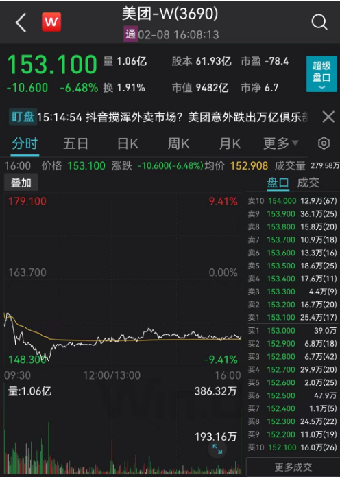 在抖音团购配送项目的刺激下,美团股价今日盘中大跌逾9%,市值跌破万亿港元。截至收盘,美团股价报153.1港元,跌超6%,市值为9482亿港元。