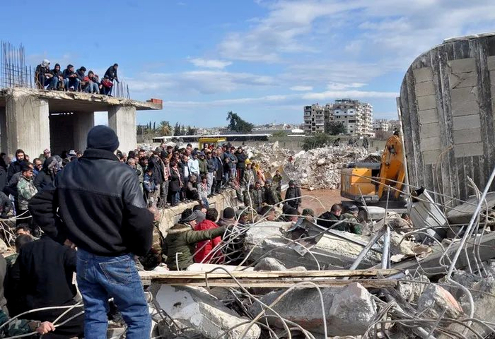 2月7日,人们聚集在叙利亚拉塔基亚省的一处地震废墟。新华社发