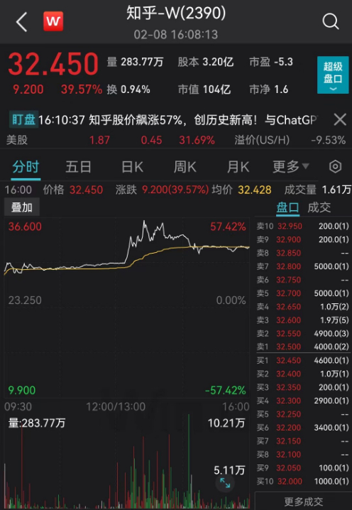 港股知乎今日盘中突然暴涨逾50%,股价创历史新高,收盘涨超39%,市值104亿港元。