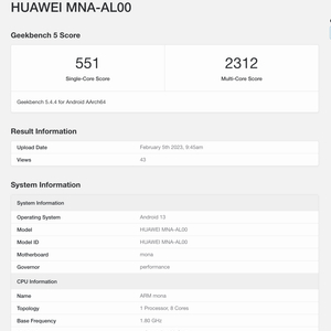Geekbench显示,华为这款型号为MNA-AL00的新机安卓底层为Android 13,内置8GB内存,单核跑分551,多核跑分2312,搭载的处理器规格为4*2.4Ghz+4*1.8Ghz,对应高通骁龙778G。