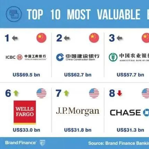 在榜单前十中,除这四家中国大型商业银行外,招商银行以245.36亿美元的品牌价值位列第十位。其余的五家银行均来自美国,分别为:美国银行(Bank of America)、富国银行(Wells Fargo)、摩根大通(J.P. Morgan)、大通银行(Chase)、花旗集团(CITI)(见图表1)。