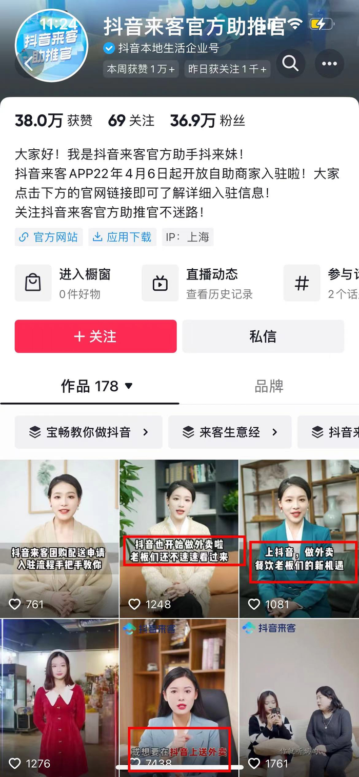 《科创板日报》记者注意到,在抖音官方的本地生活商家服务经营平台,“抖音来客”的抖音账号上,从今年1月开始便在连续推介“如何申请在抖音上做外卖”。