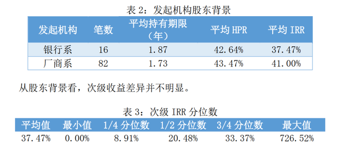 在主流的按揭贷款、车贷、卡贷、消费贷等基础资产类型中,AutouLoan汽车信贷资产证券发行量靠前且期限并不太长,因而能较快完成清算,为统计提供了较好的样本空间。本文简要梳理了2012-2022年以来银行间市场完成清算的98单车贷资产证券化项目,根据其受托报告和清算报告逐一计算了次级证券的内部收益率(IRR)和持有期总收益率(HPR)水平,并结合产品结构梳理了次级证券收益的组成形式,以期为市场提供参考。