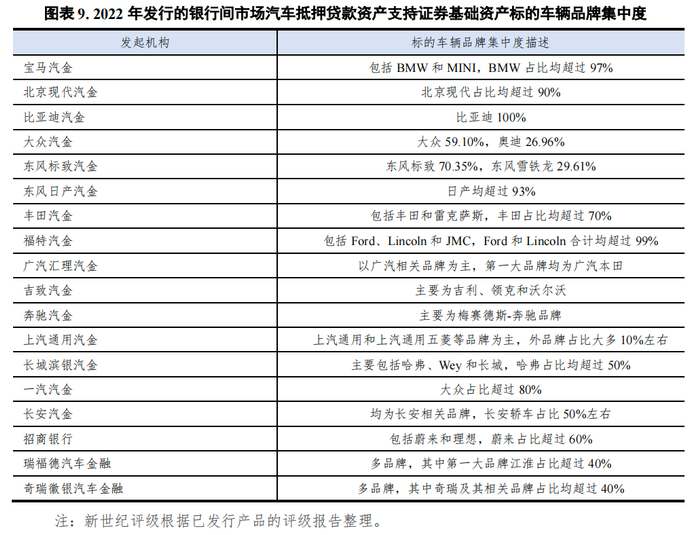 如图表8所示,同期发行的汽车抵押贷款资产支持证券基础资产标的车辆大多存在一定品牌集中度。当基础资产汽车品牌集中度很高时,信托期限内,若上述品牌车辆发生大规模召回,或者相应主机厂经营出现问题,可能会降低借款人还款意愿,进而影响汽车抵押贷款资产支持证券的还本付息。