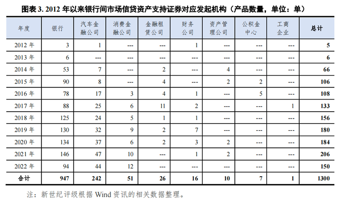 从机构类型来看,2022年,银行间市场信贷资产支持证券的发起机构仅为银行、汽车金融公司和消费金融公司。其中,银行作为发起机构的资产支持证券当年发行数量仍占据主导地位,但发行规模较上年大幅下降79.95%,汽车金融公司成为当年该市场最主要的发起机构。