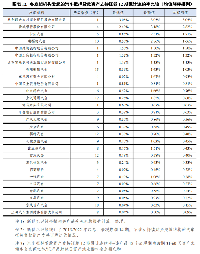 此外,新世纪评级还考察了不同发起机构发起的汽车抵押贷款资产支持证券12期累计违约率。截至2022年末,银行间市场汽车抵押贷款资产支持证券12期累计违约率为0.54%。