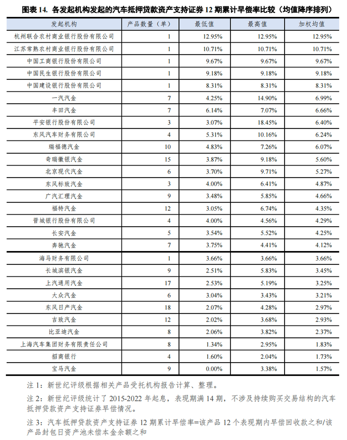 此外,新世纪评级还考察了不同发起机构发起的汽车抵押贷款资产支持证券12期累计早偿率。截至2022年末,银行间市场汽车抵押贷款资产支持证券12期累计早偿率为3.89%,除招商银行、上海汽车集团财务有限责任公司和海马财务有限公司外,另有7家汽车金融公司加权平均12期累计违约率低于市场均值。
