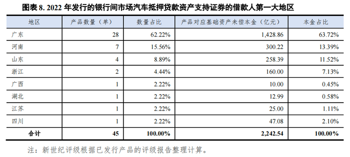 同期发行的汽车抵押贷款资产支持证券基础资产借款人第一大地区分布主要是广东省。以河南省为第一大地区的产品包括北京现代汽金发起的2单产品、一汽汽金发起的2单产品、吉致汽金发起的2单产品和上汽通用汽金发起的1单产品;以山东省为第一大地区的产品包括奇瑞徽银汽金发起的2单产品以及上汽通用汽金和大众汽金分别发起的1单产品。