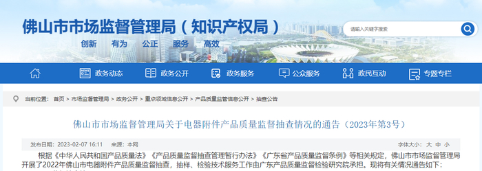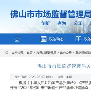 中国质量新闻网讯 2023年2月7日,广东省佛山市市场监督管理局网站发布关于电器附件产品质量监督抽查情况的通告(2023年第3号)。通告称,根据相关规定,该局开展了2022年佛山市电器附件产品质量监督抽查,抽样、检验技术服务工作由广东产品质量监督检验研究院承担。