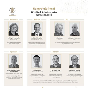 2023年沃尔夫化学奖被联合授予芝加哥大学教授何川、美国斯克里普斯研究所科学家杰弗里-W-凯利(Jeffery W. Kelly)和日本东京大学教授菅裕明(Hiroaki Suga),以表彰他们开拓性的发现,阐明了RNA和蛋白质的功能和病理机能障碍,并创造了以新方式驾驭这些生物聚合物来改善人类疾病的策略。