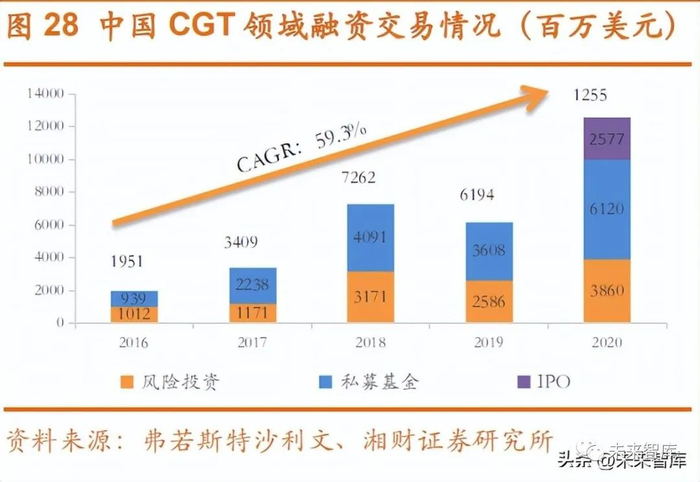 基因治疗赛道最受资本青睐。CGT 领域未来空间巨大,有望引领第三次 医药革命,据中国 CGT 领域融资交易情况显示,2020 年度 CGT 领域融资总 金额约为 126 亿美元,2016 年至 2020 年复合年增长率达到 59.3%。2020 年 IPO 和私募基金金额显著增加。预计未来整个医药投融资市场仍会保持较 高活跃度,CGT 领域的资本投入仍会增加,资本注入也将推动 CGT 产业发 展。从 2022 年 H1 投融资情况看基因治疗赛道最受资本青睐,免疫细胞治疗 热度也处于第二梯队。