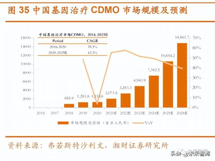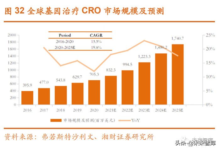 中国 CGT 临床试验数量爆发式增长,数量仅次于美国,有望弯道超车:在国家利好政策的推动下,CGT 行业将迎来快速发展阶段。据弗若斯特沙利 文数据,自 2015 年开始,中国 CGT 疗法的临床试验数量增长快速。2015 到 2020 年间,累计开展了约 250 项 CGT 临床试验,已成为数量仅次于美国 的地区,年复合增长率超过 60%,位列全球第一。目前,中国正在开展的 CGT 临床试验约 100 项,涉及大小公司约 80 家。2016 年至 2020 年,全球基因治疗 CRO 市场规模从 4.0 亿美元增长至 7.1 亿美元。随着基因治疗行业的快速发展,未来全球基因治疗 CRO 市场规 模将持续稳步增长,预计于 2025 年增至 17.4 亿美元。2016 年至 2020 年, 中国基因治疗 CRO 市场规模从 1.7 亿元增长至 3.1 亿元,预计将于 2025 年 增至 12.0 亿元。