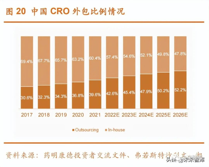 伴随着全球及中国医药研发投入的不断提升,中国 CRO 外包比例呈现上 升趋势且增速快于美国,并在未来 5 年仍将保持更快增长趋势。据弗若斯特 沙利文数据,2021 年中国 CRO 外包率达到 39.6%,预期到 2026 年整体外 包率将达到 52.2%。2021 年美国 CRO 外包率达到 50.3%,预期到 2026 年 整体外包率达到 60.5%。