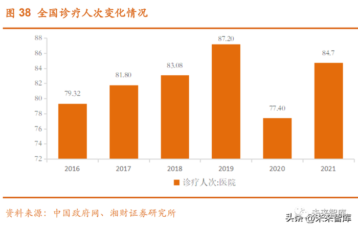 健康意识的增强及慢性病病例的激增促使人们尽早发现并采取主动预防 措施是推升就诊人次不断提升的重要因素,全国诊人次已从 2016 年的 79.32 亿人次增长至 2019 年的 87.20 亿人次,期间复合增长率为 3.2%。疫情影响 2020 年中国医院门诊量和住院人次大幅下滑,2021 年医疗服务数据大幅反 弹,但 2022 年初以来的疫情继续对医疗服务形成较大压制。